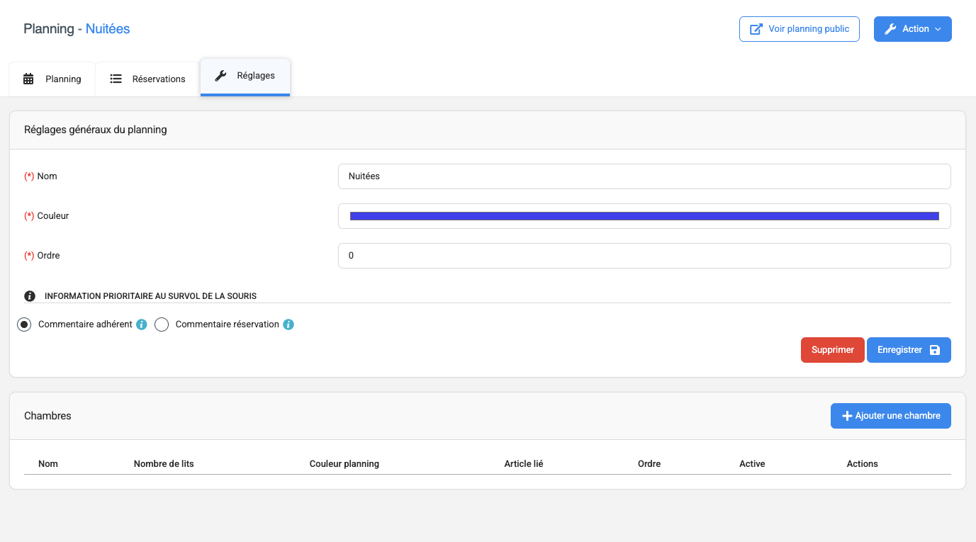 Donnez un nom à votre chambre, le nombre de lits, la couleur de la chambre dans le planning, l'article lié (à créer dans le module Réglages > Finances > Articles), l'ordre dans la liste de votre chambre.